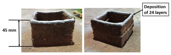 The square structure of stainless steel (SS304) was deposited by the GMAW process, as shown in Figure 9. The use of CO2 for SS304 deposition can create chromium oxide, which is not desired in deposited samples. Due to these limitations, the sample was deposited using argon gas. With a bead height of 2 mm, there was an improvement in bead quality. A total height of 45 mm was obtained after 24 layers of deposition.