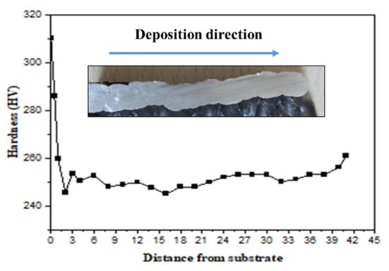 Hardness variation along the deposition height at the interface.