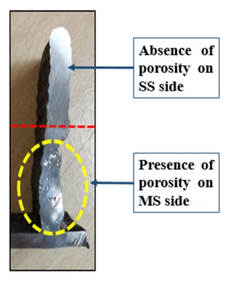 A square structure of mild steel and stainless steel bimetallic structure was deposited by the GMAW process, as shown in Figure 12. The layers were deposited using an inter-pass time of 5 min after the deposition of every layer. The height of the deposition was 45 mm. Porosity was observed (Figure 13) on the mild steel side; this could be due to the arc blow, resulting in an unstable arc. Because mild steel is a ferromagnetic material, the possibility of an arc blow due to magnetic forces is high; an unstable arc results in increased spatter. On the stainless steel side, no porosity was observed, and the spatter was also very low in comparison to that of the mild steel; this could be due to the nonmagnetic nature of SS 304. The shielding gas pressure is important in the formation of porosity; as the gas pressure decreases, the amount of porosity increases. Another sample was deposited with the optimal shielding gas pressure and a controlled process (removing the metal stuck to the torch nozzle due to spatter to prevent arc blow).