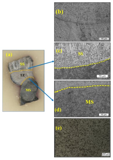 (a) Intersection of MS and SS304; (b) microstructure of SS304; (c), (d) microstructure at indicated locations; (e) microstructure of MS.