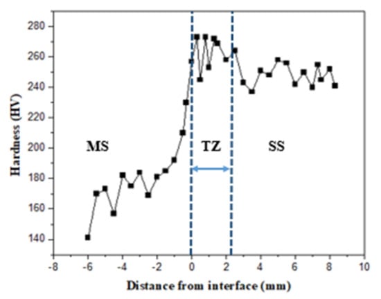 - The mechanical properties, microstructure, and composition of the bimetallic specimen were investigated and compared with the mechanical properties of a single MS and SS material specimen. The hardness was observed to be higher in SS section in both the longitudinal and transverse directions and was in the range of 240–260 HV. However, in the MS section the hardness was in the range of 160–180 HV. The diffusion of chromium from the SS side into the MS is responsible for the increased hardness.