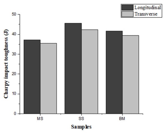 Charpy V sub-sized test samples were prepared in transverse and longitudinal directions. Figure 18 shows the Charpy test results of the samples tested in both directions. The Charpy impact toughness was higher in the longitudinal direction, which could be due to grain growth in the AM components along the cooling direction and results in good bonding between the layers (Figure 18). The impact toughness of SS304 was higher than that of mild steel and bimetal. The impact toughness of bimetal was between those of mild steel and SS304. In the longitudinal direction, due to good bonding at the interface, the impact toughness was increased. In the transverse sample, the breakage initiated in the mild steel, causing a reduction in impact toughness. Even though there was a difference in toughness values in the longitudinal and transverse directions, it was so small that we can conclude that the Charpy toughness is found regardless of testing direction. The fracture surfaces exhibited a typical pattern for ductile materials (Figure 19). Because the fracture surface of the specimens was not shinier and comprised grooves and dimples, we can conclude that it was a ductile failure [30,31].