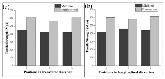 Tensile strength variation in (a) transverse and (b) longitudinal directions in mild steel and stainless steel.