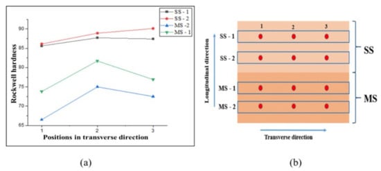 Studies by Hui et al. [32] show the conversion of hardness and hardness-strength conversion calculated from the theoretical equation. A satisfactory match was observed when the calculated and standard values were compared. It was observed that the strength values obtained by Rockwell hardness (HR) result in a better fit with the standard values than those produced by Vickers (HV) and Brinell hardness (HB). Thus, using Rockwell hardness data to determine the sample’s tensile strength is advantageous. The hardness variation trend was similar to that of Vickers harness. The hardness values were converted into tensile strength as per the conversion table given in [33] which is produced from ASTM A370.