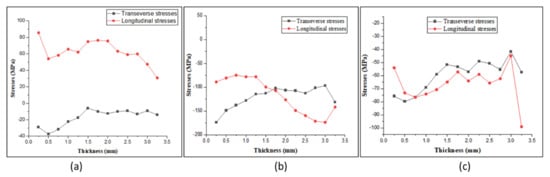 Residual stress distribution through thickness on (a) SS304, (b) interface, and (c) mild steel.