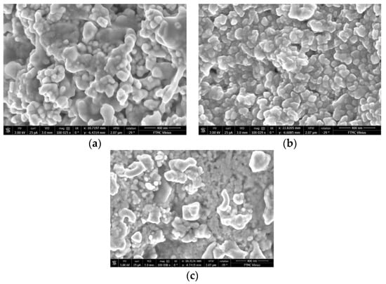 SEM images of phosphate ceramics with different Ag particle sizes and concentrations are presented in Figure 1. The study of the surface morphology of prepared composite samples showed that Ag particles were quite homogeneously distributed in the ceramics matrix, independent of their size and concentration.