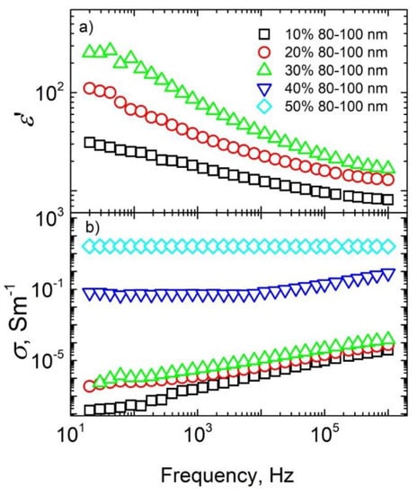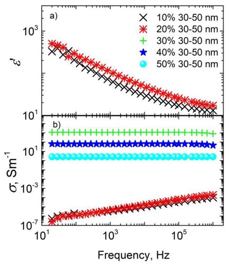 For some ceramics, the electrical conductivity is frequency-independent at low frequencies; this effect was particularly observed for ceramics with 30–50 nm sized nanoparticles and concentrations not lower than 30 wt.%, and for ceramics with 80–100 nm sized nanoparticles and concentrations not lower than 40 wt.%. The frequency-independent conductivity at low frequencies is related to DC conductivity. Therefore, the above-indicated concentrations (30 wt.% for ceramics with 30–50 nm sized nanoparticles and 40 wt.% for ceramics with 80–100 nm sized nanoparticles) were close to the percolation threshold in the systems. Thus, the percolation threshold was higher for ceramics with bigger nanoparticles. Such a percolation threshold value is in agreement with excluded volume theory [23,24], while the increasing of the percolation threshold with nanoparticles size can be explained by the better distribution of nanoparticles inside ceramic matrices. Unfortunately, the dielectric permittivity in the frequency range 20 Hz–1 MHz was determined only below the percolation threshold, because at higher Ag nanoparticle concentrations tgδ is very high and the dielectric permittivity cannot be determined. Below the percolation threshold, the dielectric permittivity values were quite low (about 10–20 at 1 MHz) and were almost concentration-independent. Electrical conductivity values under such conditions were also quite low and were strongly dependent on frequency.