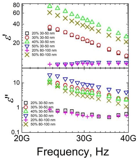 where kz = 2π/λ and k2z = 2πε0.5/λ are wave numbers in the vacuum and the sample’s media correspondingly, and τ is the thickness of the layer. The absorption of the layer was calculated as A = 1 − (S11)2 − (S21)2. Obtained calculations results for ceramics layers with thickness 2 mm at 30 GHz are summarized in Table 1. It can be concluded that the absorption of some ceramics (for example, the absorption of ceramics with 50 wt.% inclusions of 30–50 nm size is 61%) was quite high. Moreover, by application of the Salisbury screen method [25] to the presented ceramics it was possible to obtain even 100% absorption. These results are better than those previously reported for ceramics with SiC nanoinclusions or carbon nanotubes [3,4,26]. Although values of complex dielectric permittivity decrease with frequency according to the Jonscher universal power law [27,28], they increase with nanofiller concentration. Thus, microwave transmission is lower for ceramics with higher filler concentration.