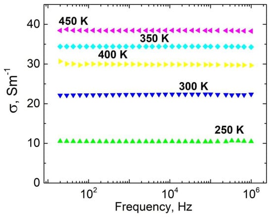 Frequency spectra of electrical conductivity for ceramics with 50 wt.% Ag nanoinclusions (80–100 nm) are presented in Figure 5. From these spectra is possible to conclude that the AC conductivity coincided with DC conductivity values in the frequency range 20 Hz–1 MHz. Additionally, the electrical conductivity changed several times in the temperature range 250–450 K, which is important for evaluation of the thermal stability of coatings for electromagnetic shielding applications.