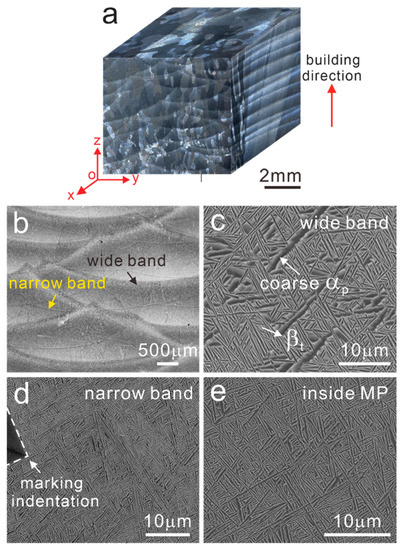 As well known, powder and laser moved simultaneously in the LMD process, which is also referred to as laser coaxial powder-feeding technology [31]. Owing to the comprehensive effects of high laser energy input and scanning path overlaps, powders would experience a complex thermal history of melting, solidification and reheating. Figure 2 presents the stereoscope, OM and SEM images of the as-deposited LMD-TC11 sample. As seen from the yoz plane, there are notable large melting pools (MP) with a height of 1.1 mm and width of 4.4 mm caused by laser input and scanning strategy. Columnar grains with an average width of about 0.5 mm grow through several layers driven by epitaxial growth and the growth direction is perpendicular to the melting pools. The equiaxed-like grains shown on the xoy plane are the cross-sections of the columnar grains. On the side of the xoz plane, there are layer strips with an average width of 0.6 mm parallel to the laser scanning tracks. Different from the small-scale MPs of SLM parts [32], the MPs in the LMD samples are relatively larger, containing two types of distinct MPs characterized by wide bands and narrow bands respectively, as shown in Figure 2b. The enlarged microstructural image of the wide band is presented in Figure 2c and a special bimodal structure consisting of coarse primary α (αp) laths and fine β transformed (βt) microstructure could be found. However, the narrow bands marked by an indentation are characterized by a fine basketweave microstructure that is virtually identical to that inside MPs formed due to rapid cooling rate (Figure 2d,e). To our knowledge, wide bands and narrow bands are induced by layer-by-layer building behaviors, and wide bands are commonly referred to as the heat-affected bands (HABs). As reported by Zhu et al. [15], the manufacturing process of the N + 3 layer could affect the N layer to form the αp and βt structures in the HABs. Concerning the narrow bands, these bands remained after annealing in the single β region and they could be attributed to the chemical composition homogenization difference caused by the superheating effect in the layer-by-layer manufacturing process [16]. The grains in the narrow band, the wide band and inside the MP were also characterized using EBSD and EBSD results are shown in Figure 3b,e,h. It could be found that the basketweave morphologies existed in the narrow band and inside the MP, while in the wide band, coarse αp grains become much more common, which is consistent with the SEM images. According to statistical analysis, the average width of α laths in the wide band is 0.61 μm, higher than that in the narrow band and inside the MP, which are 0.52 μm and 0.54 μm, respectively. Moreover, the t-test was used to compare the mean of the lath widths to verify that the difference in lath widths is statistically significant.