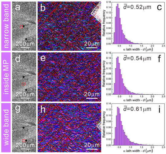 OM images and corresponding inverse pole figures (IPFs), α lath width distribution of the EPT7 sample: (a–c) narrow band, (d–f) inside the MP, (g–i) wide band. (The black diamonds are the marking indentations of wide band and narrow band, and the red square is the EBSD scanning region.)