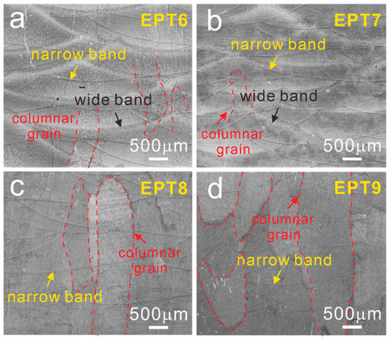 After being treated with different EPT voltages, OM observations were taken out and the OM images are shown in Figure 4. It could be found that when the EPT voltage was chosen below 8 kV, as seen from Figure 4a,b, the yoz planes are composed of MPs with wide bands and narrow bands, almost the same as that in the as-deposited samples. Interestingly, wide bands disappeared as the EPT voltage reached 8 kV and 9 kV (Figure 4c,d). The columnar grains still existed after EPT, which was different from the equiaxed grains found in the SLM Ti6Al4V alloy after being treated at 8 kV and 9 kV [30]. As reported by Gao et al. [30], the average width of the columnar grains in the SLM Ti6Al4V alloy was 100 μm and the columnar grains transformed to the equiaxed grains after being treated with 8 kV. The difference in the columnar grain evolutions in the LMD and SLM Ti6Al4V alloys may be caused by the large size (several hundred microns) of columnar grains in the LMD samples, as seen in Figure 2a.
