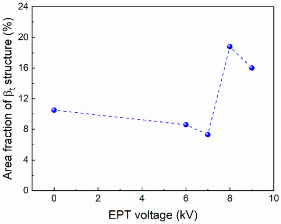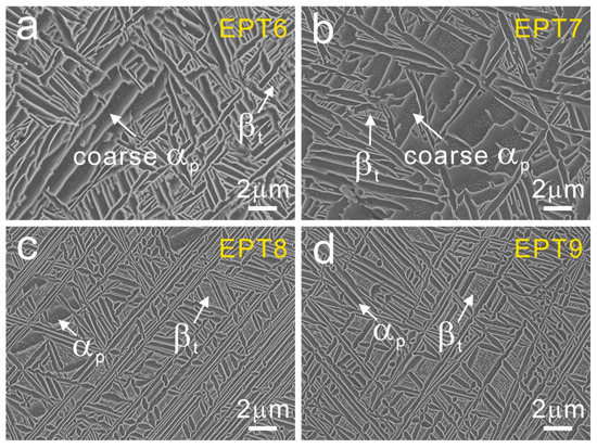 Detailed SEM observations were carried out to further analyze the microstructures. The typical microstructure in wide bands was used to monitor the microstructural evolutions. After being treated with EPT voltages of 6 kV and 7 kV, as shown in Figure 5a,b, the wide bands present a similar bimodal structure as that in the as-deposited sample. After being treated with EPT voltages of 8 kV and 9 kV, there are no obvious wide band MPs (Figure 4) and the microstructural morphologies become more uniform, as presented in Figure 5c,d. It could be seen that there are more homogeneous αp + βt basketweave structures in the EPT-8 and EPT-9 samples compared with that in the as-deposited samples. The area fractions of the βt structure in the as-deposited and EPT samples were calculated using the SEM images in Figure 2b and Figure 5. The area fraction values of βt are 10.5%, 8.6%, 7.3%, 18.8% and 16.0% for the EPT0, EPT6, EPT7, EPT8 and EPT9 samples, respectively. It could be seen from Figure 6 that the βt content presents an increasing trend as EPT voltage increases.