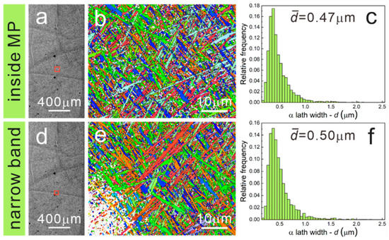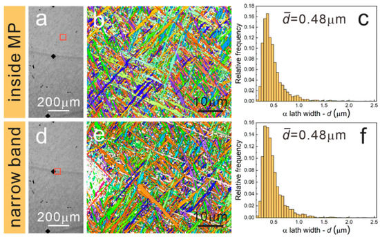 OM images and corresponding inverse pole figures (IPFs), α lath width distribution of the EPT9 sample: (a–c) narrow band, (d–f) inside the MP. (The black diamonds are the marking indentations of wide bands, and the red square is the EBSD scanning region).