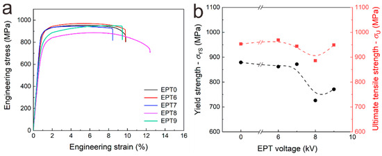 Tensile properties of the as-deposited and EPT samples. (a) Engineering stress–strain curves; (b) yield strength and ultimate tensile strength versus EPT voltages.