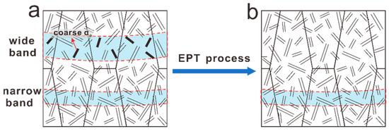 Schematic diagram of microstructural evolutions: (a) as-deposited sample, (b) EPT sample.