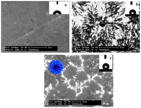 SEM of the untreated and modified surface of SS type AISI 410S. (a) Untreated and etched surface (CA = 71.5° ± 3). (b) Modified surface in an SA solution for one hour (CA = 122.8° ± 2). (c) Modified surface in an SA solution with the addition of 2.0 wt% of E307 for one hour (CA = 138.7° ± 3) [27].