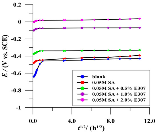 The open circuit potential (OCP) was determined for the treated and untreated surfaces of SS AISI 410S in a simulated solution of acid rain with a pH of 3. The change in OCP was monitored over a period of 120 h. In all cases, an increasing tendency of the OCP towards a less negative value was observed, even in the case of the untreated surface (Figure 3). In the case of the untreated surface, the OCP value stabilised after one hour of exposure to the selected corrosive medium, indicating the beginning of the formation of the protective passive layer. A compact passive layer was formed only after prolonged exposure after 25 h, which was confirmed by the impedance spectroscopic measurements (Section 3.2.3). In the case of the modified SS surfaces (the self-assembled hydrophobic layer of SA with and without the addition of E307), stabilisation occurred much faster, between 240 and 600 s. In the cases presented, it was fastest when the surface was modified with (SA + 2.0% E307) and slowest with SA alone. Moreover, a stronger shift of the OCP values was observed towards less negative values. Such OCP response already predicts good inhibitory properties of the thus as-prepared self-assembled hydrophobic layer, even in such acidic medium pH = 3. According to the OCP value, the layer consisting of (SA + 2.0% E307) could be considered the highest quality of all, and the layer consisting of (SA + 1.0% E307) can be rated equally high. The OCP values for these two layers were different from the values for the other three layers. The OCP values of the passive layer and the hydrophobic layer (SA only) did not differ significantly, perhaps in stabilisation time, but the stabilisation of the OCP was faster in the case of SA. However, the good influence of E307 on the quality of the hydrophobic layer can already be observed in the case of the hydrophobic layer (SA + 0.5% E307). The value of the OCP was somewhere between the other two groups. Considering the OCP value, it can be assumed that the added concentration of E307 was too low for the selected corrosive medium to achieve sufficient protection.