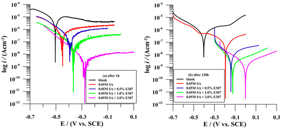 Classical potentiodynamic measurements and electrochemical impedance spectroscopy (EIS) were performed to evaluate the corrosion resistance of the metal matrix SS AISI 410S and the further modified stainless steel surfaces in a simulated acid rain solution at pH 3. The polarisation curves of the unprotected surface of SS AISI 410S and the surface modified with self-assembled hydrophobic layers with and without the addition of different concentrations of E307 were recorded after 60 min and after 120 h of immersion of the electrode in a stagnant and naturally aerated simulated acid rain solution at pH 3. Figure 4 shows the polarisation curves of the different samples at shorter and longer time intervals of immersion of the samples in the selected corrosive medium. The electrochemical parameters obtained from the polarisation measurements, such as anodic Tafel slope (βa), cathodic Tafel slope (βc), corrosion current density (icorr), corrosion potential (Ecorr), and polarisation resistance (Rp) and inhibition efficiency (η%), calculated according to Equations (1) and (2), are listed in Table 1 and Table 2.