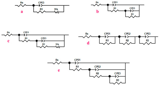 Fitting of the experimental impedance spectra was performed using appropriate electrical equivalent circuits (EEC). Figure 5 shows the EECs used, which yielded the fitting curves that best matched the experimental values. As is well known, the elements of the EEC consist of a combination of resistors (R) and the constant phase element (CPE) in series with Rs (the resistance of the electrolyte). The experimental data showed a frequency dispersion; thus, a modelling element with frequency dispersion behaviour, a constant phase element (CPE), was used, i.e., the shape of the depressed semicircles indicated a non-ideal capacitive behaviour. For this reason, a constant phase element (CPE) must be used in the modelling to achieve an optimal fit. The heterogeneity of the surface, resulting from the surface roughness, porosity or inhomogeneous distribution of the surface properties of the electrode, is the main reason for the phenomenon of frequency depression, which was then taken into account in the CPE.