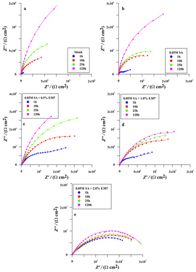 EIS Nyquist plots of SS AISI 410S samples for bare and modified surfaces measured after 1, 10, 25, and after 120 h of immersion at their open-circuit potential in a simulated solution of acid rain with pH = 3 at 25 °C: (a) Blank, (b) SA, (c) (SA + 0.5% E307), (d) (SA + 1.0% E307) and (e) (SA + 2.0% E307) (measured data-dotted symbols and fitted data-solid lines).