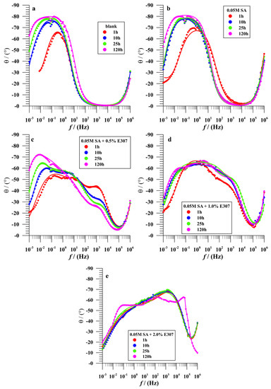 Bode-phase angle plots of SS AISI 410S samples for bare and modified surfaces measured after 1, 10, 25, and after 120 h of immersion at their open-circuit potential in a simulated solution of acid rain with pH = 3 at 25 °C: (a) Blank, (b) SA, (c) (SA + 0.5% E307), (d) (SA + 1.0% E307) and (e) (SA + 2.0% E307) (measured data-dotted symbols and fitted data-solid lines).