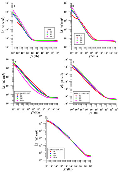 Bode-|Z|-module plots of SS AISI 410S samples for bare and modified surfaces measured after 1, 10, 25, and after 120 h of immersion at their open-circuit potential in a simulated solution of acid rain with pH = 3 at 25 °C: (a) Blank, (b) SA, (c) (SA + 0.5% E307), (d) (SA + 1.0% E307) and (e) (SA + 2.0% E307) (measured data-dotted symbols and fitted data-solid lines).