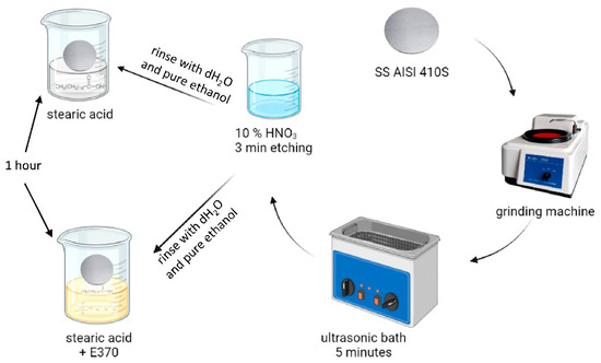 The AISI 410S stainless steel specimens (⌀ = 1.2 cm) were first ground with various grits of emery paper (320, 400, 600, 800, 1000, and 1200), cleaned ultrasonically with alcohol and deionised water and dried with compressed air. To create a superhydrophobic surface, we used a simple immersion method. The samples were etched chemically in 10% HNO3 for 3 min, after which the etched samples were rinsed quickly with deionised water followed by pure ethanol, and immersed immediately in an ethanol solution of 0.05 M SA or in a mixture of 0.05 M SA + x wt% E307, x = (0.5, 1.0, and 2.0) wt% (hereafter wt% = %) at room temperature for 1 h. The modified surfaces of SS thus obtained were dried with compressed air to perform further characterisation or electrochemical measurements. The immersion time was constant, one hour, as was the concentration of the stearic acid, c = 0.05 M. The entire sample preparation procedure is shown in Scheme 1.