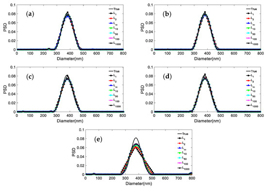 Inversion PSD of 381.1 nm unimodal particles under different norms and noise levels. (a) 0; (b) 0.0005; (c) 0.001; (d) 0.005; (e) 0.01.