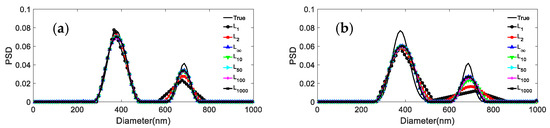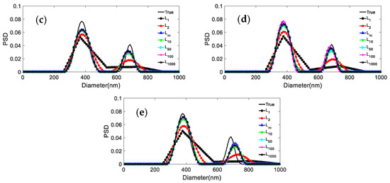 It can be seen from the results reported in Figure 2 and Figure 3 and Table 3, Table 4, Table 5 and Table 6 that: (1) For both particle systems, the inversion results differ greatly for different norms at the same noise level. The gap between the inversion PSD of L1 and the true distribution is the largest, followed by the L2. The difference between the inversion results of other norms and the true distribution is not significant. (2) With the increase of the p parameter, the distribution error shows a decreasing trend, and the peak value error remains unchanged or decreases. (3) Compared with the distribution error of L1 and L2, the maximum reduction of the distribution errors for L∞ are 0.3597, 0.2613, and 0.3587, 0.1522 for the 376.3 nm/685.6 nm and 236.5 nm/685.6 nm particle systems, respectively. (4) For both particle systems, the peak value error is not discussed here because the inversion results of L1 are poorly smoothed, sometimes the bimodal PSD characteristics cannot be obtained, and the gap with the true PSD is very large. Compared with the peak value error of L2, the maximum reduction in peak value errors for L∞ are 0.0263/0.0728 and 0.0432/0 for the 376.3 nm/685.6 nm and 236.5 nm/685.6 nm particle systems, respectively.