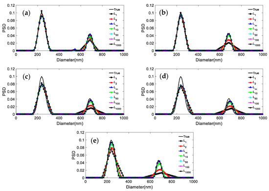 Inversion PSD of 236.5 nm/685.6 nm bimodal particles under different norms and noise levels. (a) 0; (b) 0.0005; (c) 0.001; (d) 0.005; (e) 0.01.