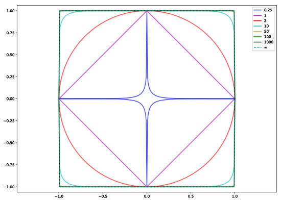 The following phenomena can be summarized from Figure 1, Figure 2 and Figure 3 and Table 2, Table 3, Table 4, Table 5 and Table 6: (1) The difference between the distribution errors of L10~L∞ is not obvious under various noise conditions. (2) In general, the distribution error of L10~L∞ is smaller compared with L2. The reason for this phenomenon can be explained by the principle of norms. The unit balls defined under the p norms are all convex sets, but when 0 < p < 1, the unit ball under that definition is not a convex set. Figure 4 shows the shape of the unit ball for different values of p, from 0.25 to ∞. It can be seen from Figure 4 that for L10~L∞, their unit ball shapes are closer, and therefore the results obtained from L10~L∞ are also closer. Considering from the equation (13) that L∞ has the features of a simple calculation, L∞ is chosen for the inversion.