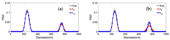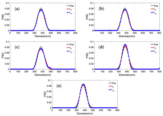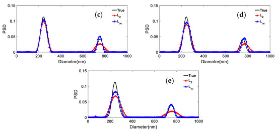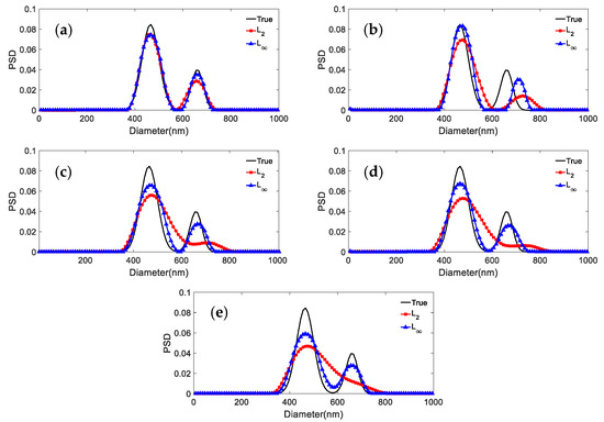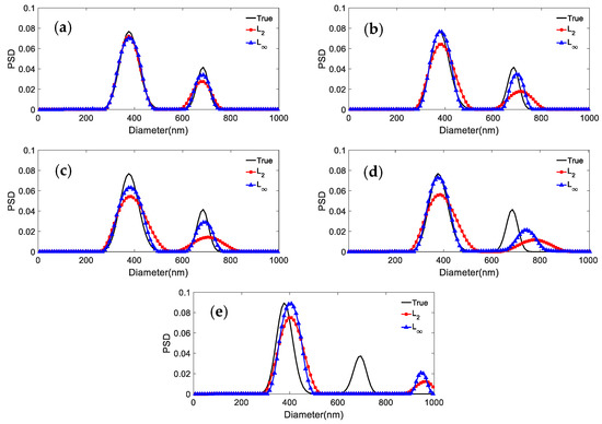 Three sets of simulated PSD data are used to generate the ACF for bimodal particles. The shape distribution parameters for the distributions with parameters 466.1 nm/655.7 nm, 376.3 nm/685.6 nm, and 246.5 nm/755.5 nm, respectively, are given in Table 10. Figure 6, Figure 7 and Figure 8 show the results obtained with the L2 and L∞ models for the same PSD and different noise levels. Table 11 shows the peak value positions of the inversion results. Table 12 shows the distribution errors inversed by the two models under different noise levels: