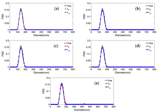 Inversion PSD of 150.7 nm unimodal particles under different norms and noise levels. (a) 0; (b) 0.0005; (c) 0.001; (d) 0.005; (e) 0.01.