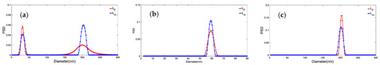 The following phenomena can be summarized from Figure 5, Figure 6, Figure 7, Figure 8 and Figure 9 and Table 8, Table 9, Table 11 and Table 12, that: The inversion peak value position and peak value height obtained by the L∞ are closer to the true values, and the inversion distribution errors are lower than the L2. The reason for this phenomenon can be explained as that for L2 and L∞, both are essentially based on the principle of looking for a solution to the DLS regularized problem, which is essentially an iterative solution problem to Equations (10) and (18)