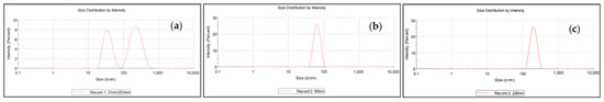 Bimodal and unimodal particles inversion results from the Malvern instrument (a) 31 nm/203 nm; (b) 61 nm; (c) 203 nm.