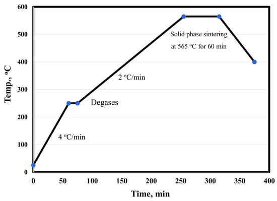 The surface of alumina and graphene nanosheet reinforcements was chemically treated to remove contamination by stirring in 10 wt. % NaOH and acetone for 1 h, respectively. Then, the treated reinforcements were coated with 5 wt. % nano-Ag by the electroless plating process [20,21,22,23,24,25]. Silver nitrate was dissolved (3 gm) in 1 L of distilled water, and the pH of the solution was adjusted to 11; then, the reinforcement powder was added. Stirring was continued for 5 min to ensure the dispersion of the powder particles in the solution. Formaldehyde solution (38%) was added to 85 vol. % of the used water. The reaction was completed within 30 min. The powders were filtered and then dried at 80 °C in a drier for 3 h. The main objective of the metallization process of graphene and Al2O3 was to improve their wettability and adhesion with aluminum matrix during the sintering process. Six samples were prepared: Al, Al-10Cu, Al-10Cu/2.5Al2O3, Al-10Cu-2.5Al2O3/0.5GNs, Al-10Cu-2.5Al2O3/1GNs, and Al-10 Cu-2.5 Al2O3/1.5GNs. After adjusting the composition of the samples, they were mechanically alloy-milled (MAM) in a stainless-steel container for 45 h to increase the homogeneous distribution between all of the sample constituents. Liquid hexane (5%) was used during the mixing process as a processing agent to prevent the accumulation of nanoparticles, which may be produced during the milling process. The process was performed with a 1:10 powder-to-ball ratio at 350 rpm. Then, the samples were compacted with a uniaxial press into a 10-mm diameter die at 600 MPa. The diameter of the used alumina balls was 12 mm. The samples were sintered at 565 °C in a vacuum furnace for 60 min with a low heating rate of 2 °C/min. Figure 2 shows the sintering cycle of the fabrication process.