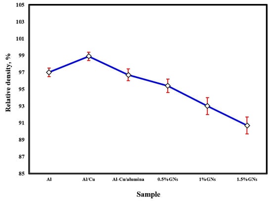 The effect of sintering temperature and the addition of copper, alumina nanoparticles, and varying percentages of graphene nanosheets on the relative density of aluminum is represented in Figure 3. The sintering process at 565 °C achieved a satisfactory relative density. Improving the density by increasing the sintering temperature enhanced the adhesion between the particles, consequently reducing porosity. The addition of 10 wt. % Cu to the Al matrix increased the total composite density due to the high density of copper 8.9 g/cm3 and its excellent distribution and adhesion with the Al matrix, enhancing the wettability between them. By adding 2.5 wt. % Al2O3 nanoparticles to the Al-10 wt. % Cu sample, the density was decreased due to the low density of alumina (3.95 g/cm3). Furthermore, the density of Al-10Cu-2.5Al2O3 was gradually reduced by increasing the graphene nanosheet content, possibly as a result of the density of graphene nanosheets being lower than that of both metallic Al and Cu (about 2.2 g/cm3) or because with increased graphene nanosheet content, agglomerations formed, decreasing the wettability with the aluminum matrix and enhancing the formation of pores [27,28].