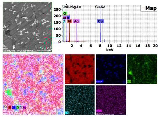 Because the used alumina particles were nano-sized and not detected by SEM (BSE), mapping was performed with EDAX analysis, as shown in Figure 5. All used elements were confirmed, and no impurities or foreign elements were detected, with excellent distribution of all elements.