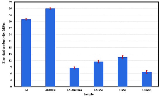 The effect of graphene nanosheets was observed; their addition to the Al-10Cu-2.5Al2O3 nanocomposite increased the electrical conductivity from 8.66 MS/m to 11.54 MS/m at 0.5 wt. % GNs with 33.25 wt. % increments. By increasing the graphene nanosheet content to 1 wt. %, the electrical conductivity was increased to 13.62 MS/m, then decreased to 1.5 wt. % and reaching 6.67 MS/m. The decrease in the electrical conductivity at 1.5 wt. % GNs is due to the increase in GN agglomeration. The percentage of graphene agglomerates naturally increases the rate of interstitial spaces that resist the movement of electrons, reducing the passage of electric current [31].