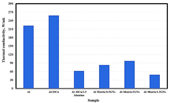The thermal conductivity of the fabricated samples is shown in Figure 7. The pure metallic aluminum exhibited thermal conductivity of 222 W/mK, and by adding 10 wt. % Cu, this value was increased to 258 W/mk. The addition of 2.5 wt. % Al2O3 nanoparticles reduced the thermal conductivity of Al/10 Cu from 258 to 62 W/mK. The observed reduction in the thermal conductivity of Al/10 Cu may be due to the low thermal conductivity of alumina nanoparticles, which are classified as a non-conductive ceramic material. Because graphene has a high thermal conductivity of 4000 W/mK, that of Al/10 Cu/2.5 Al2O3 was increased from 62 to 83 and 97.5 W/mK at 1 wt. % GNs, then decreasing to 48.4 W/mK for 1.5 GNs samples. The reduction in thermal conductivity in the case of the 1.5 wt. % GNs sample may be due to the formation of agglomerations in the metal matrix, which increase the air gaps between the reinforcements and the matrix and decrease the conduction behavior of the composite material. In other words, accumulation leads to the formation of micropores and air gaps that restrict the movement of electrons and reduce the thermal conductivity [32].