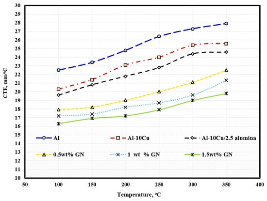 The effects of temperature, the addition of 2.5 wt. % Al2O3 nanoparticles, and the addition of varying graphene nanosheet contents on the CTE of aluminum are shown in Figure 8. Regarding the temperature impact, it is clear that the higher the operating temperature, the greater the thermal expansion. The increase in thermal expansion is due to the increase in the kinetic energy of atoms as a result of increased temperature. Temperature is an essential function of kinetic energy responsible for the movements of atoms and molecules composed of the entire material structure. When any material is exposed to temperature, the atoms and molecules absorb heat, which is converted to heat energy, increasing the vibrations of the atoms and molecules; by increasing the temperature, the movement of the atoms and molecules in increased, and the distance between them also increases, leading to increased sample dimensions.