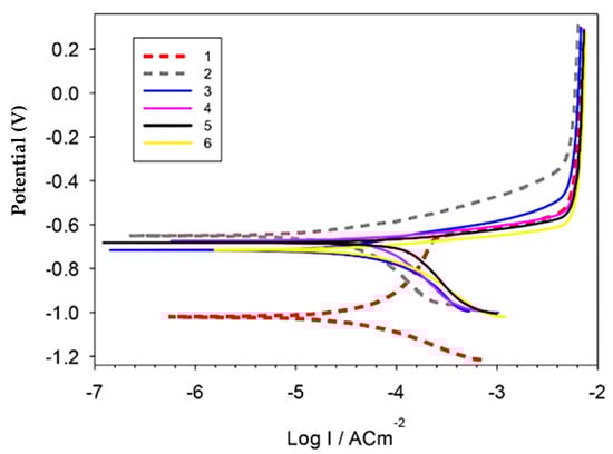 Figure 9 and Table 1 represent the polarization curves and corrosion parameters of the produced Al, Al-10Cu, Al-Cu/2.5 nano-Al2O3, Al-Cu-nano-Al2O3/0.5 GNs, Al-Cu-nano-Al2O3/1 GNs, and Al-Cu-nano-Al2O3/1.5 GNs nanocomposites in 3.5 NaCl solution. The polarization behavior of the Al matrix was changed by adding copper, alumina nanoparticles, and varying percentages of graphene nanosheets. The addition of copper nanoparticles shifted the Ecorr in the negative direction by about −0.4 V and decreased the corrosion rate from ≈0.78 to ≈0.58 mm/yr. The Al-10Cu sample also showed a pseudo-passive region. The addition of 2.5% alumina nanoparticles to the Al-10Cu primarily increased the corrosion rate to 1.449 mm/yr, which is the highest value among all samples. The addition of alumina nanoparticles may increase the boundaries of the particles exposed to the solution, thus increasing the rate of chemical corrosion. The addition of 0.5–1 wt. % graphene nanosheets to the Al-10Cu-2.5Al2O3 decreased the corrosion rate to 1.27 and 0.98 mm/yr, respectively. Further addition of graphene nanosheets resulted in an increase in the corrosion rate. The significant reduction in the corrosion rate for the Al/10Cu sample can be attributed to the enhancement of the corrosion resistance of Al as a result of the addition of more noble Cu metal and the disappearance of pores in the microstructure. On the contrary, the increase in corrosion rate in the presence of Al2O3 nanoparticles can be attributed to the presence of pores in the Al-Cu-Al2O3 matrix, which facilitated the penetration of the corrosive medium into the sample, causing its corrosion. However, the addition of GNs significantly improved the corrosion resistance of the Al-Cu-Al2O3 nanocomposite. GNs improve the Al-Cu-Al2O3 nanocomposite surface quality as a result of their inertness and distribution in the Al matrix. Furthermore, GNs exhibit good corrosion resistance, so reinforcing an Al matrix GNs decreased the corrosion rate and protected the investigated samples from the corrosive solution [33]. The graphene layer has a large specific surface area relative to its volume ratio, and its addition to the Al-Cu-Al2O3 nanocomposite resulted in thorough distributed on the interface of a large number of grain boundaries that may be subject to corrosion, leading to a reduction in the rate of chemical corrosion. The corrosion rate for the 1.5 wt. % GN sample was high due to the formation of pores in the GN agglomeration regions, facilitating the penetration of the corrosive medium into the composite. Additionally, the increase in the exfoliated graphene nanolayers activates the galvanic corrosion of Al, increasing the corrosion rate [20].