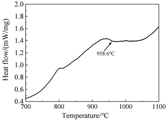 The experimental material was TC4 alloy. A billet was cut in the middle part of the ingot with a size of 80 × 70 × 50 mm3, which was produced by an electron beam cold hearth melting process at an average melting rate of 500 kg/h. A melting power of 200~210 kW was used to melt the alloy, and a power of 180~185 kW was used to ensure a constant temperature in the surface. The vacuum pressure was 0.1~1.0 Pa during the melting process. The dimension of the crystallizer was 1270 × 220 × 200 mm3 and the size of the cold hearth was 1450 × 400 × 250 mm3. The hot-rolled sheet was obtained by first rolling along the length direction and then rolling along the width direction. The chemical composition of the titanium alloy sheet was measured by chemical analysis, as shown in Table 1. The β-phase transformation temperature was obtained by differential scanning calorimetry (DSC) of the alloy at about 958.6 °C, as shown in Figure 1. The samples were further heat-treated with solution-plus-aging treatment. First, the sheet was heated to 930 °C and kept for 15 min, then cooled in water for solution treatment, kept at 560 °C for 2 h, 3 h and 4 h, and then furnace cooled (FC) for aging treatment. The standard tensile specimens built in a horizontal plane for tensile property evaluation, as shown in Figure 2, were cut in the rolling direction (RD) and transverse direction (TD).