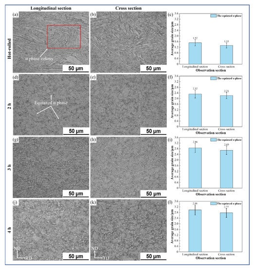 The purpose of aging treatment is to decompose the metastable phase formed after heat treatment. Solution treatment and then quenching in water to effect aging is performed to precipitate the secondary phase with a dispersed distribution to enable strengthening [15,17,18]. The microstructures of the TC4 alloy which were obtained by solution treatment and aging treatment for different times (2 h, 3 h, and 4 h) are shown in Figure 3. It can be seen from the figure that the structure was composed of a large number of α-phase colonies and a small number of β-phase colonies, with a small amount of recrystallized equiaxed α-phase dispersed in it. From Figure 3a, b, it can be seen that the thick α-phase colonies in the longitudinal section and the cross-section of the hot-rolled sheet were distributed, and that the β-phase was distributed among them with the same degree of distribution. The average grain sizes of the equiaxed α-phase in the longitudinal section and cross-section were about 1.52 μm and 1.33 μm, respectively. The microstructures after aging for 2 h in the longitudinal section and cross-section are shown in Figure 3d, e. The microstructure consisted of a few equiaxed α-phases and some β phases. The average grain sizes of the equiaxed α-phase in the longitudinal section and cross-section were about 2.32 μm and 2.21 μm, respectively. For the transverse cross-section, the SEM images of the alloy are shown in Figure 4. It can be seen from Figure 4b that many secondary α-phases were precipitated on the transformed β matrix; the volume fraction of the primary equiaxed α-phase was about 31.2%. As shown in Figure 3g,h, the average grain sizes of the equiaxed α-phase in the longitudinal section and cross-section were about 2.83 μm and 2.69 μm, respectively. It can be seen from Figure 3g,h that the microstructure was composed of many primary α-phases (equiaxed and lamellar) and transformed β phases, and thick α laths were distributed along the rolling direction. It can be seen from Figure 4c that the microstructure was composed of many primary equiaxed α-phases and transformed β phases; the volume fraction of the primary equiaxed α-phase was about 31.0%. Compared with the microstructure after aging for 2 h, the primary α phase, lamellar α-phase and secondary α-phase on the β matrix had merged and developed. As shown in Figure 3j,k, the average grain sizes of the equiaxed α-phase in the longitudinal section and cross-section were about 2.98 μm and 2.77 μm, respectively. It can be seen from Figure 3j,k that, with prolongation of the aging time, the microstructure was still composed of some equiaxed primary α-phases and a few transformed β phases. The volume fraction of the equiaxed α-phase was calculated according to the area fraction of the phase in the figure. It can be seen from Figure 4d,e that the average grain size of the equiaxed primary α-phase increased. This phenomenon reflected the grain growth of the α phase; however, the volume fraction of the primary α-phase did not change too much and its value was about 30.2%. The α-phase tended to be equiaxed, indicating that grain globularization had occurred, and the content of the transformed β-phase decreased gradually. To sum up, the structural evolution of the sheet under different aging times is shown in Figure 5. With increase in aging time, the average grain size of the primary equiaxed α-phase increased gradually and grain globularization occurred; however, the volume fraction of the primary α-phase was not obviously changed. The morphology of the transformed β-phase was obviously changed with increase in aging time; the secondary α-phase precipitated on the β matrix appeared to be merged and matured, and the content of the transformed β-phase gradually decreased. This phenomenon was also observed in other titanium alloys [24,25].
