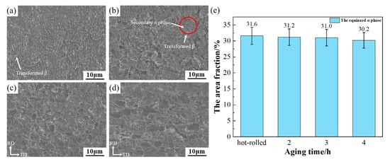 SEM images of TC4 alloy aged sheets: (a) Hot-rolled (b) 2 h (c) 3 h (d) 4 h (e) the area fraction of equiaxed α phase.