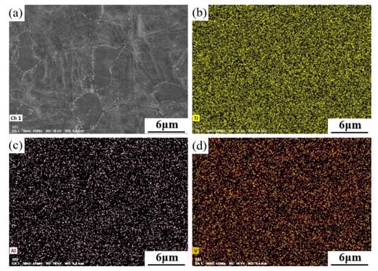 Figure 6 shows the energy spectrum of the sheet obtained after aging for 2 h. It can be seen from Figure 6b that the element Ti in the hot-rolled sheet after solution-plus-aging treatment was uniformly distributed in the structure, and there was no segregation. As shown in Figure 6c,d, the elements Al and V were also uniformly distributed in the structure, and there was basically no aggregation of Al or V elements at the grain boundaries of the equiaxed α phase.