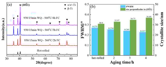 The XRD patterns of the sheets are shown in Figure 7a. It can be seen from the figure that the phase compositions of the hot-rolled and heat-treated sheets were mainly α/α′-Ti and β-Ti [26] and exhibited the highest diffraction peak at 40.5°. The peak intensities of each phase of the heat-treated sheet were significantly higher than that of the unheated sheet. With increase in aging time, the peak intensities of (