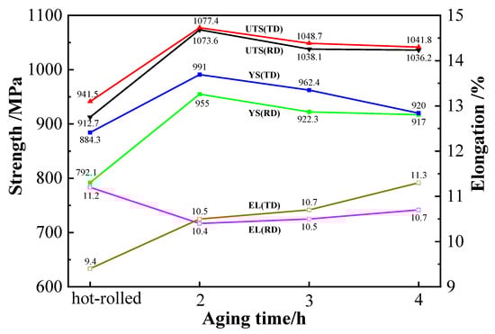 The TC4 alloy sheets obtained by heat treatment were subjected to tensile tests unidirectionally at room temperature in the RD and TD directions. The mechanical properties are shown in Figure 8. It can be seen from the figure that the tensile strength (UTS), yield strength (YS) and elongation (EL) of the hot-rolled sheets in the RD and TD directions were 912.7 and 941.5 MPa, 792.1 and 884.3 MPa, and 11.2% and 9.4%, respectively. The UTS, YS and EL of the sheets after aging for 2 h were 1073.6 and 1077.4 MPa, 955.0 and 991.0 MPa, and 10.4% and 10.5%, respectively. After aging for 3 h, they were 1038.1 and 1048.7 MPa, 922.3 and 962.4 MPa, and 10.5% and 10.7%, respectively. They were 1036.2 and 1041.8 MPa, 917.0 and 920.0 MPa, and 10.7% and 11.3% after aging for 4 h, respectively. With increase in aging time, the strength of the sheet decreased and the plasticity slightly increased This corresponded to the evolution of the microstructure [15,17]. The differences in UTS, YS and EL of the hot-rolled and heat-treated sheets in RD and TD directions were: 28.8 MPa, 92.2 MPa and 1.8% (hot-rolled); 3.8 MPa, 36.0 MPa and 0.1% (2 h); 10.6 MPa, 40.1 MPa and 0.2% (3 h); 5.6 MPa, 3.0 MPa and 0.6% (4 h). The difference between the anisotropy of the sheets obtained after different aging times was small, and the comprehensive properties of the sheet after aging for 2 h were the best. The effect on the anisotropy of the sheets was similar to other titanium alloys [13,28]. Compared with the hot-rolled sheet, the UTS and YS of the sheet obtained after aging for 2 h in the RD and TD directions increased by 17.63% and 14.43%, 20.57% and 12.07%, respectively. The EL decreased by 7.14% in the RD direction and increased by 11.70% in the TD direction. In summary, as the aging time increased, the strength of the heat-treated sheets decreased and the plasticity increased slightly. After aging for 2 h, the sheet had the best comprehensive properties, the UTS and YS of the sheet increased, and the EL decreased compared with the hot-rolled sheet.