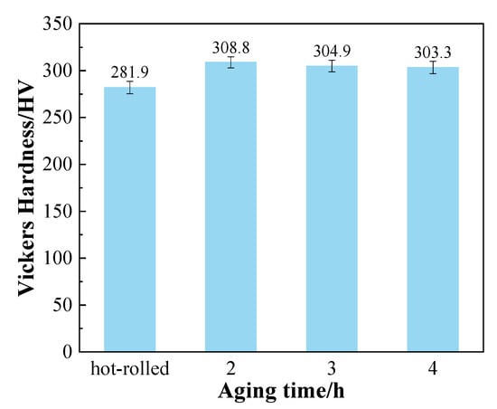 The Vickers hardness values for the TC4 alloy sheets are shown in Figure 9. It can be seen that the Vickers hardness value decreased gradually with increase in aging time. The sheet obtained after aging for 2 h had the largest Vickers hardness which was 308.8 HV. The reason for the decrease in Vickers hardness may be that, as the aging time increased, its structure and secondary α-phase on the β matrix had merged and grown up, and the transformed β had basically disappeared [3,29]. As a result, its strength and hardness were reduced.
